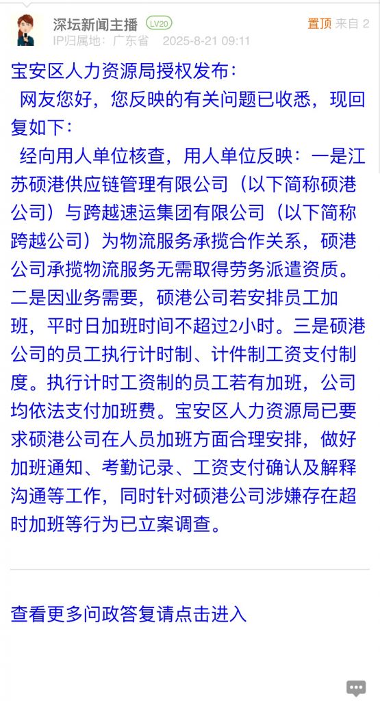 經向用人單位核查,用人單位反映:一是江蘇碩港供應鏈管理有限公司(以下簡稱碩港公司)與跨越速運集團有限公司(以下簡稱跨越公司)為物流服務承攬合作關系,碩港公司承攬物流服務無需取得勞務派遣資質。二是因業(yè)務需要,碩港公司若安排員工加班,平時日加班時間不超過2小時。三是碩港公司的員工執(zhí)行計時制、計件制工資支付制度。執(zhí)行計時工資制的員工若有加班,公司均依法支付加班費。寶安區(qū)人力資源局已要求碩港公司在人員加班方面合理安排,做好加班通知、考勤記錄、工資支付確認及解釋溝通等工作,同時針對碩港公司涉嫌存在超時加班等行為已立案調查。
