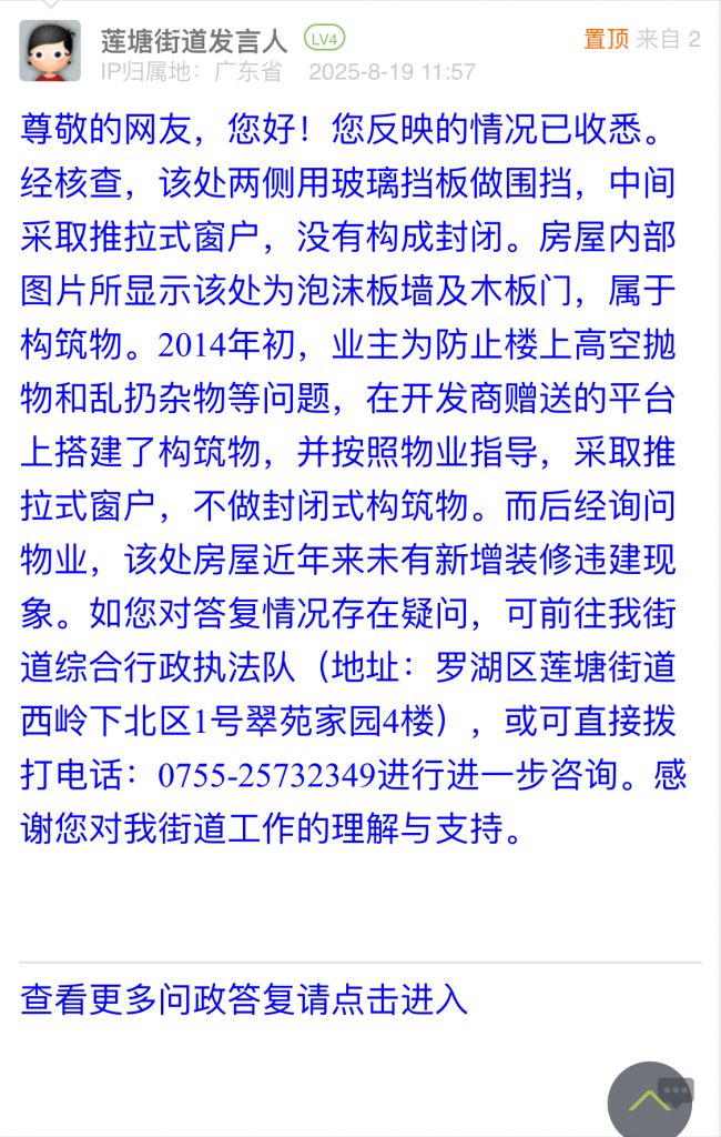 尊敬的網友,您好!您反映的情況已收悉。經核查,該處兩側用玻璃擋板做圍擋,中間采取推拉式窗戶,沒有構成封閉。房屋內部圖片所顯示該處為泡沫板墻及木板門,屬于構筑物。2014年初,業(yè)主為防止樓上高空拋物和亂扔雜物等問題,在開發(fā)商贈送的平臺上搭建了構筑物,并按照物業(yè)指導,采取推拉式窗戶,不做封閉式構筑物。而后經詢問物業(yè),該處房屋近年來未有新增裝修違建現(xiàn)象。如您對答復情況存在疑問,可前往我街道綜合行政執(zhí)法隊(地址:羅湖區(qū)蓮塘街道西嶺下北區(qū)1號翠苑家園4樓),或可直接撥打電話:0755-25732349進行進一步咨詢。感謝您對我街道工作的理解與支持。