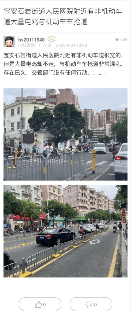 38. 帖文《寶安石巖街道人民醫(yī)院附近有非機動車道大量電雞與機動車車搶道》