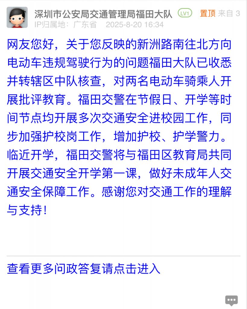 網友您好,關于您反映的新洲路南往北方向電動車違規(guī)駕駛行為的問題福田大隊已收悉并轉轄區(qū)中隊核查,對兩名電動車騎乘人開展批評教育。福田交警在節(jié)假日、開學等時間節(jié)點均開展多次交通安全進校園工作,同步加強護校崗工作,增加護校、護學警力。臨近開學,福田交警將與福田區(qū)教育局共同開展交通安全開學第一課,做好未成年人交通安全保障工作。感謝您對交通工作的理解與支持!