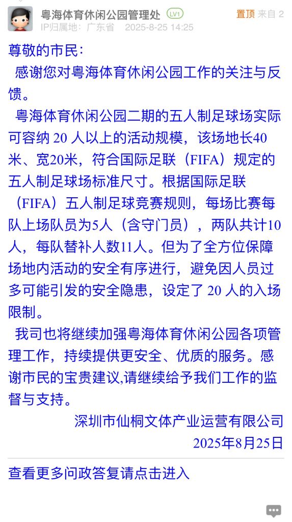 我司也將繼續(xù)加強粵海體育休閑公園各項管理工作,持續(xù)提供更安全、優(yōu)質的服務。感謝市民的寶貴建議,請繼續(xù)給予我們工作的監(jiān)督與支持。