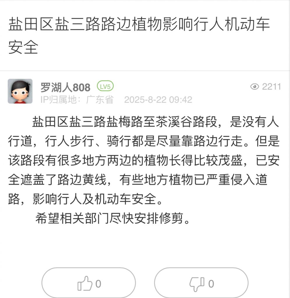 26. 帖文《鹽田區(qū)鹽三路路邊植物影響行人機動車安全》