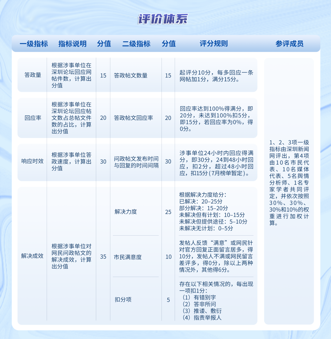 “問政深圳紅黑榜”具有科學、合理、完備的綜合評價體系,能夠綜合評估深圳各級黨政機關和公共企事業(yè)單位的答政情況。