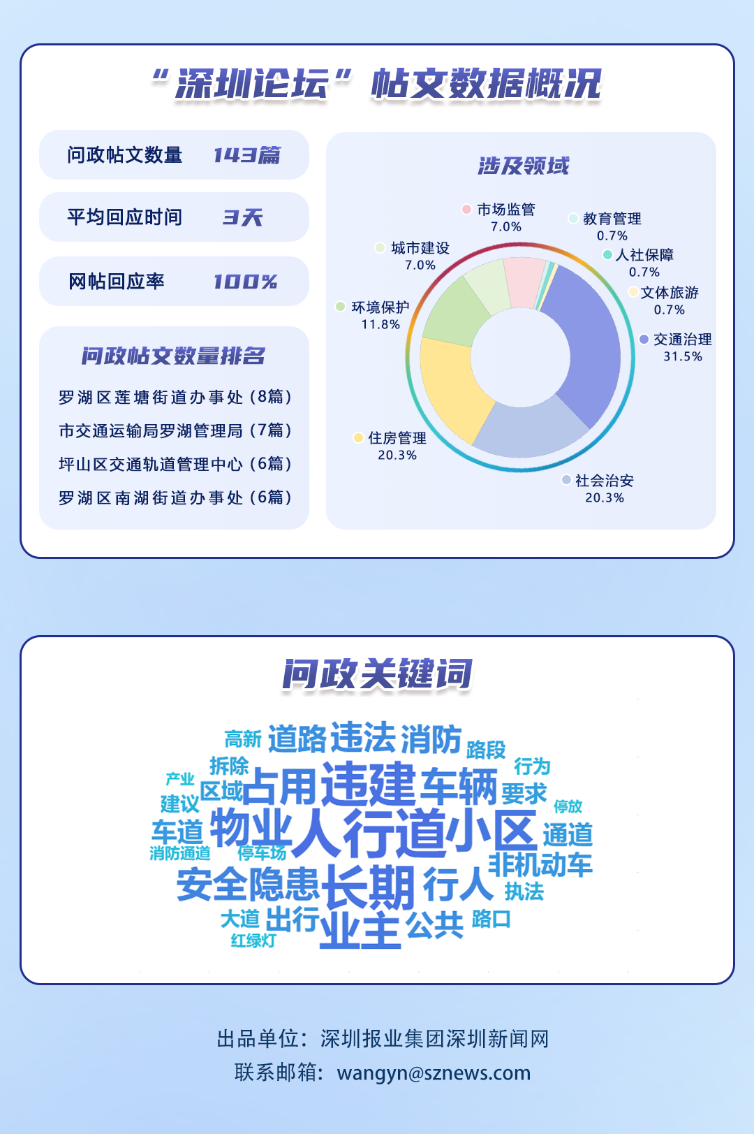 榜單帖文數(shù)據(jù)源自深圳論壇,均為網(wǎng)民點名希望涉事單位回應的網(wǎng)帖,共涵蓋68個單位、143篇網(wǎng)帖。所采集帖文發(fā)布時間為2025年7月1日至7月31日,采集截止時間為2025年8月15日。