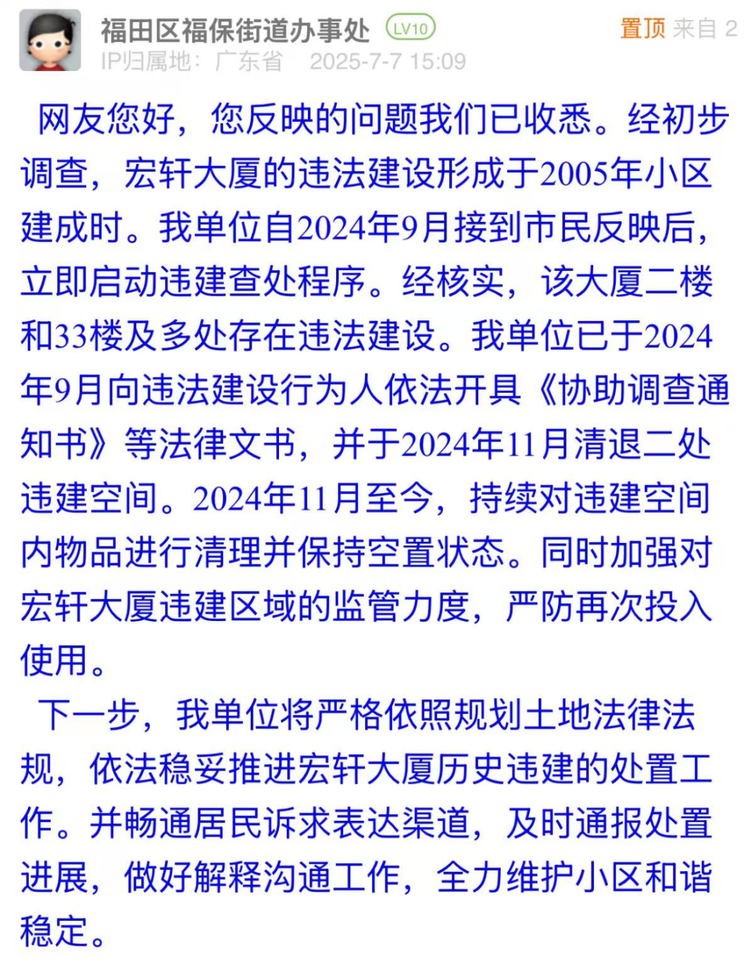 3、有市民反映福田區(qū)一大廈存在違建,希望有關部門關注處理