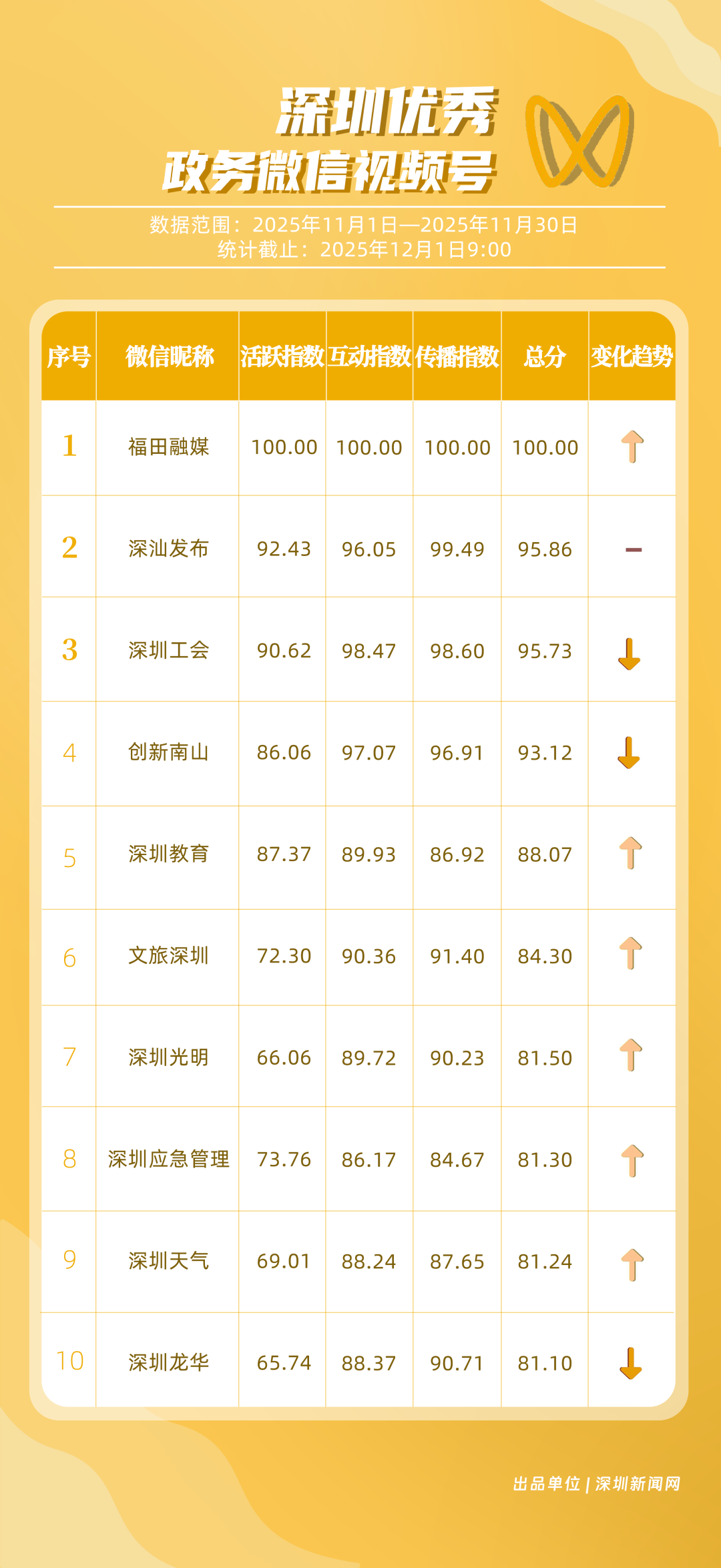 11月,深圳政務(wù)新媒體矩陣持續(xù)深耕內(nèi)容生態(tài),各單位依托平臺(tái)特色深化服務(wù)效能,福田區(qū)、南山區(qū)、市衛(wèi)生健康委員會(huì)、龍崗區(qū)、市總工會(huì)、深汕特別合作區(qū)、市氣象局(臺(tái))、中國(guó)共產(chǎn)主義青年團(tuán)深圳市委員會(huì)、龍華區(qū)、市應(yīng)急管理局的新媒體矩陣入選“深圳優(yōu)秀政務(wù)新媒體矩陣”榜單。11月,福田區(qū)新媒體矩陣憑借在微信視頻號(hào)、微博平臺(tái)的優(yōu)秀內(nèi)容,綜合得分達(dá)到94.51分,位列第一;南山區(qū)新媒體矩陣則依托在抖音平臺(tái)的滿分突破,以93.99分位居第二;市衛(wèi)生健康委員會(huì)新媒體矩陣在微信公眾號(hào)持續(xù)輸出優(yōu)質(zhì)內(nèi)容,總分排名第三位。此外,龍崗區(qū)、市總工會(huì)、深汕特別合作區(qū)新媒體矩陣持續(xù)聚焦市民需求,排名相對(duì)靠前,展現(xiàn)了深圳政務(wù)新媒體矩陣的活力。