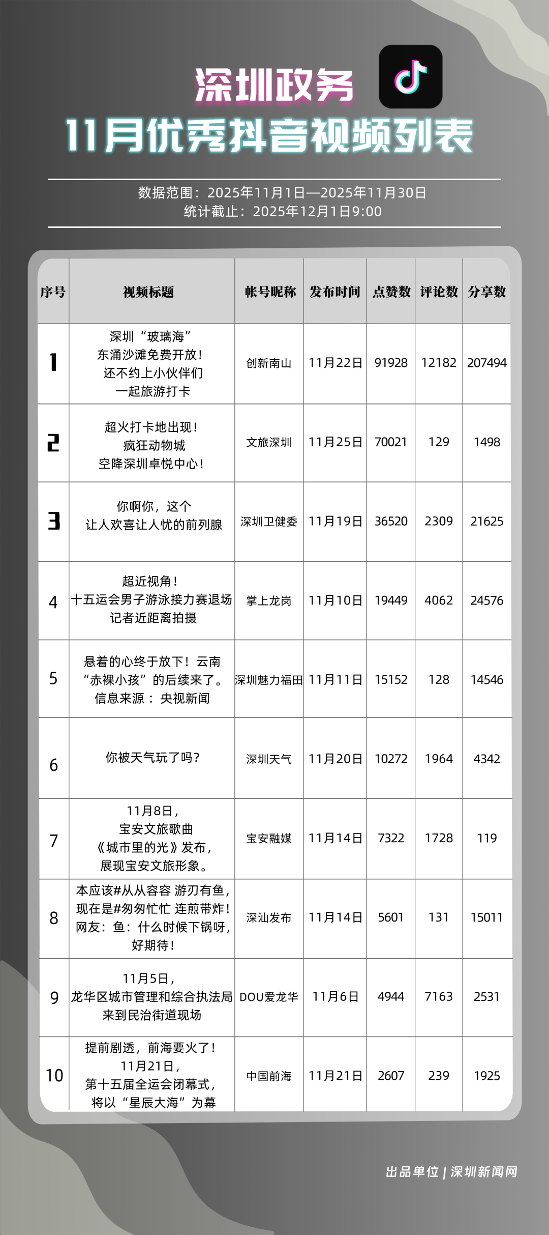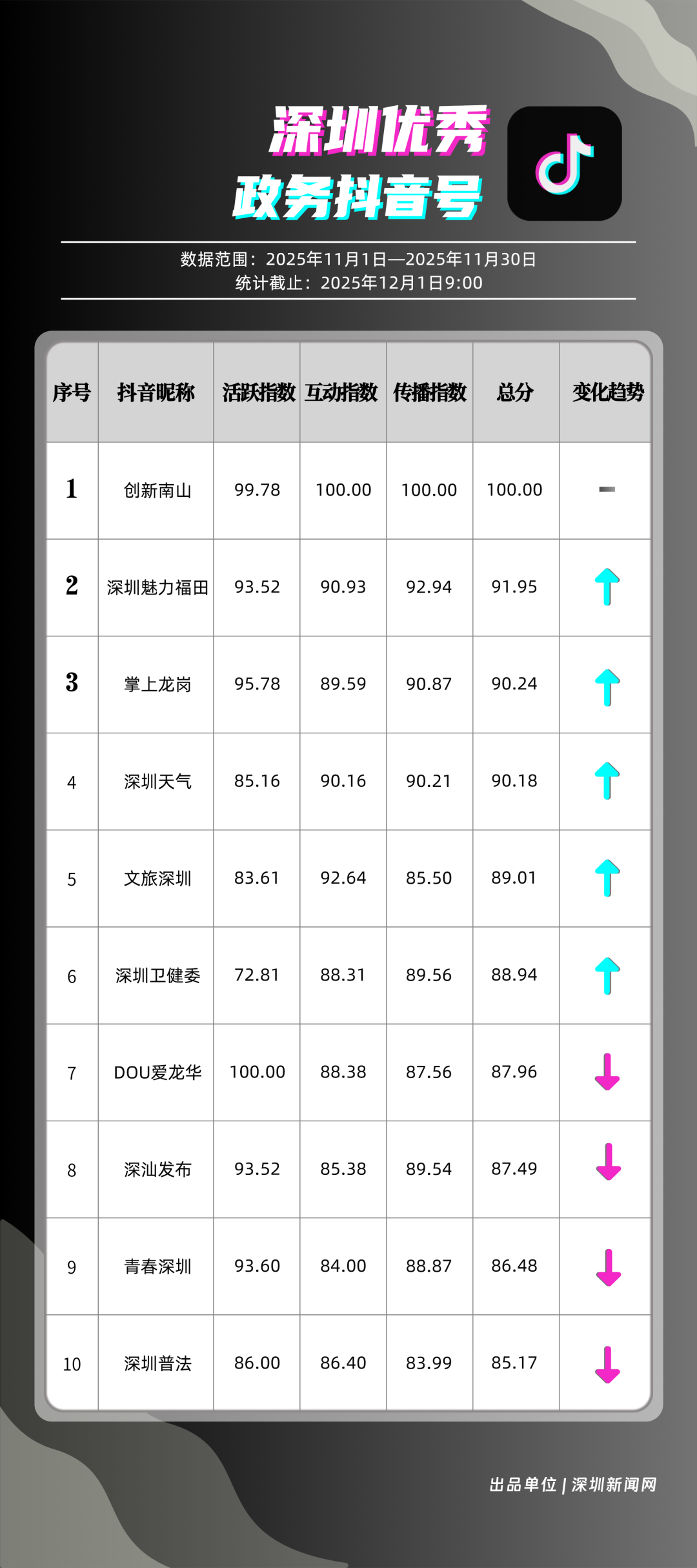 11月,獲得“優(yōu)秀政務(wù)抖音號(hào)”稱號(hào)的是“創(chuàng)新南山”“深圳魅力福田”“掌上龍崗”“深圳天氣”“文旅深圳”“深圳衛(wèi)健委”“DOU愛(ài)龍華”“深汕發(fā)布”“青春深圳”“深圳普法”。“創(chuàng)新南山”多篇文旅、健康及出行相關(guān)內(nèi)容分享超10萬(wàn)次,在互動(dòng)、傳播方面表現(xiàn)亮眼,蟬聯(lián)榜首;“深圳魅力福田”在各方面指數(shù)評(píng)分較為均衡,位列第二名;“掌上龍崗”在活躍指數(shù)得分較高,能夠較好均衡內(nèi)容數(shù)量與質(zhì)量,位居第三,排名較上期有所提高?!吧钲谔鞖狻薄拔穆蒙钲凇钡荣~號(hào)緊隨其后,得分均在90分上下。上榜優(yōu)秀政務(wù)抖音號(hào)通過(guò)深耕內(nèi)容創(chuàng)作,收獲了高點(diǎn)贊、高分享的傳播效果,也推動(dòng)評(píng)論區(qū)形成正向互動(dòng)生態(tài),最終以優(yōu)質(zhì)內(nèi)容為核心載體,增強(qiáng)政務(wù)賬號(hào)影響力。