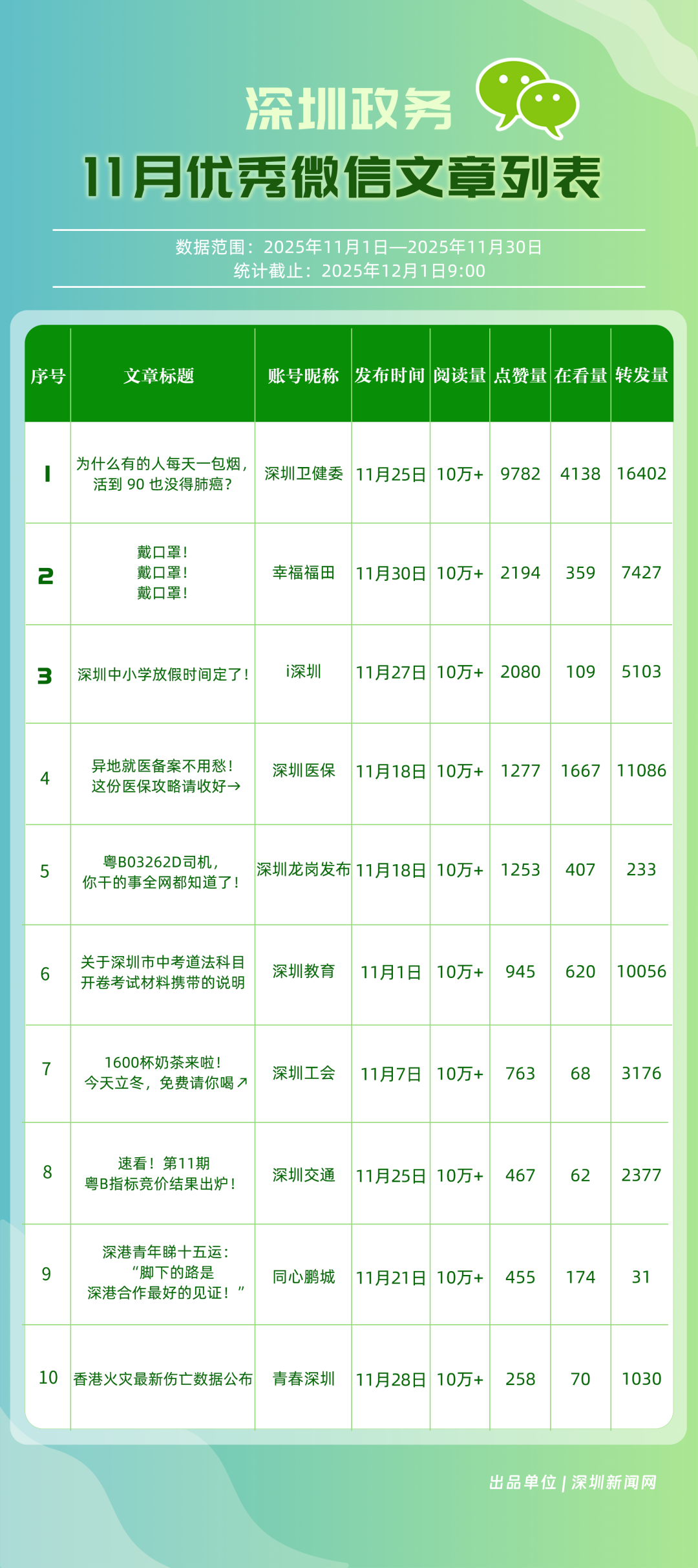 11月,“深圳衛(wèi)健委”“深圳龍崗發(fā)布”“幸福福田”“i深圳”“青春深圳”“深圳工會(huì)”“深圳光明”“創(chuàng)新南山”“深圳教育”“深圳龍華”等30個(gè)政務(wù)微信公眾號(hào)榮登“深圳優(yōu)秀政務(wù)微信公眾號(hào)”榜單。11月,“深圳衛(wèi)健委”在活躍、互動(dòng)、傳播方面均取得較好成效,以滿分位于榜單首位;“深圳龍崗發(fā)布”在傳播、互動(dòng)指數(shù)得分較高,十余篇文章閱讀量超10萬(wàn)次,位居榜單第二;“幸福福田”持續(xù)發(fā)布優(yōu)秀內(nèi)容,排名第三?!癷深圳”“青春深圳”“深圳工會(huì)”等政務(wù)賬號(hào)在信息發(fā)布中拓展信息維度、深化服務(wù)場(chǎng)景,評(píng)分在88分以上。上榜微信公眾號(hào)以高質(zhì)量?jī)?nèi)容為核心抓手,在政務(wù)傳播賽道樹(shù)立了標(biāo)桿形象,成為兼具影響力與公信力的典范。