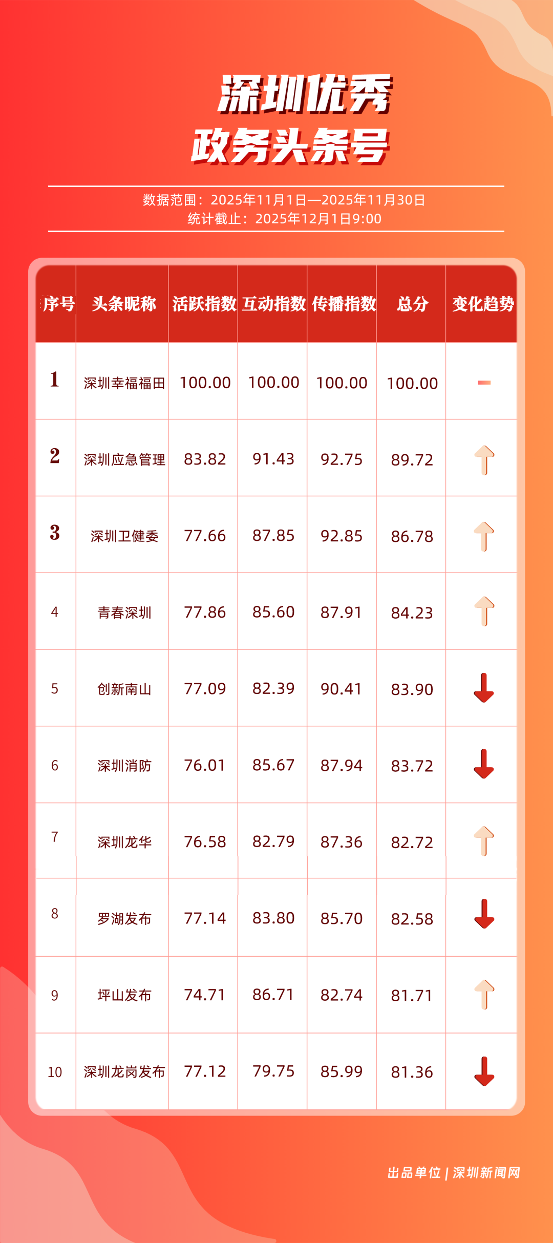11月,“深圳幸福福田”“深圳應(yīng)急管理”“深圳衛(wèi)健委”“青春深圳”“創(chuàng)新南山”“深圳消防”“深圳龍華”“羅湖發(fā)布”“坪山發(fā)布”“深圳龍崗發(fā)布”共10個(gè)政務(wù)頭條號(hào)入選“優(yōu)秀政務(wù)頭條號(hào)”榜單?!吧钲谛腋8L铩卑l(fā)揮穩(wěn)定,以滿分成績(jī)蟬聯(lián)榜首,彰顯出強(qiáng)大的政務(wù)傳播力與影響力;“深圳應(yīng)急管理”積極發(fā)布應(yīng)急、安全類內(nèi)容,位居第二;“深圳衛(wèi)健委”則以優(yōu)質(zhì)健康類信息吸引市民關(guān)注,排名上升至第3位?!扒啻荷钲凇薄皠?chuàng)新南山”“深圳消防”得分在83分以上。相關(guān)上榜賬號(hào)以內(nèi)容創(chuàng)新為紐帶,聚焦民生,為城市治理現(xiàn)代化與民生服務(wù)精細(xì)化注入了鮮活力量。