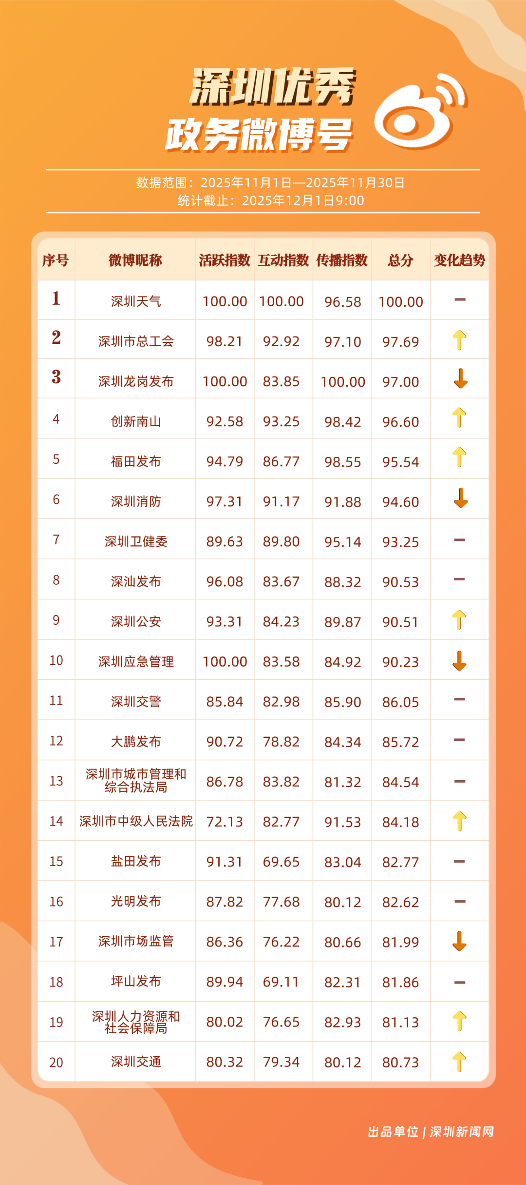 11月,20個(gè)賬號(hào)入選“優(yōu)秀政務(wù)微博號(hào)”榜單,其中包括:“深圳天氣”“深圳市總工會(huì)”“深圳龍崗發(fā)布”“創(chuàng)新南山”“福田發(fā)布”“深圳消防”“深圳衛(wèi)健委”“深汕發(fā)布”“深圳公安”“深圳應(yīng)急管理”等。其中,“深圳天氣”高頻次發(fā)布天氣類信息,受到網(wǎng)民肯定,蟬聯(lián)榜首;“深圳市總工會(huì)”發(fā)布互動(dòng)抽獎(jiǎng)、十五運(yùn)等多元內(nèi)容,排名提升至第二;“深圳龍崗發(fā)布”在傳播指數(shù)獲得較高得分,助力其位列第三。上榜優(yōu)秀政務(wù)微博賬號(hào)以優(yōu)秀內(nèi)容提升賬號(hào)競(jìng)爭(zhēng)力,贏得公眾認(rèn)可,實(shí)現(xiàn)了政務(wù)信息的有效傳播,為政務(wù)新媒體的內(nèi)容運(yùn)營(yíng)與價(jià)值傳遞提供參考。