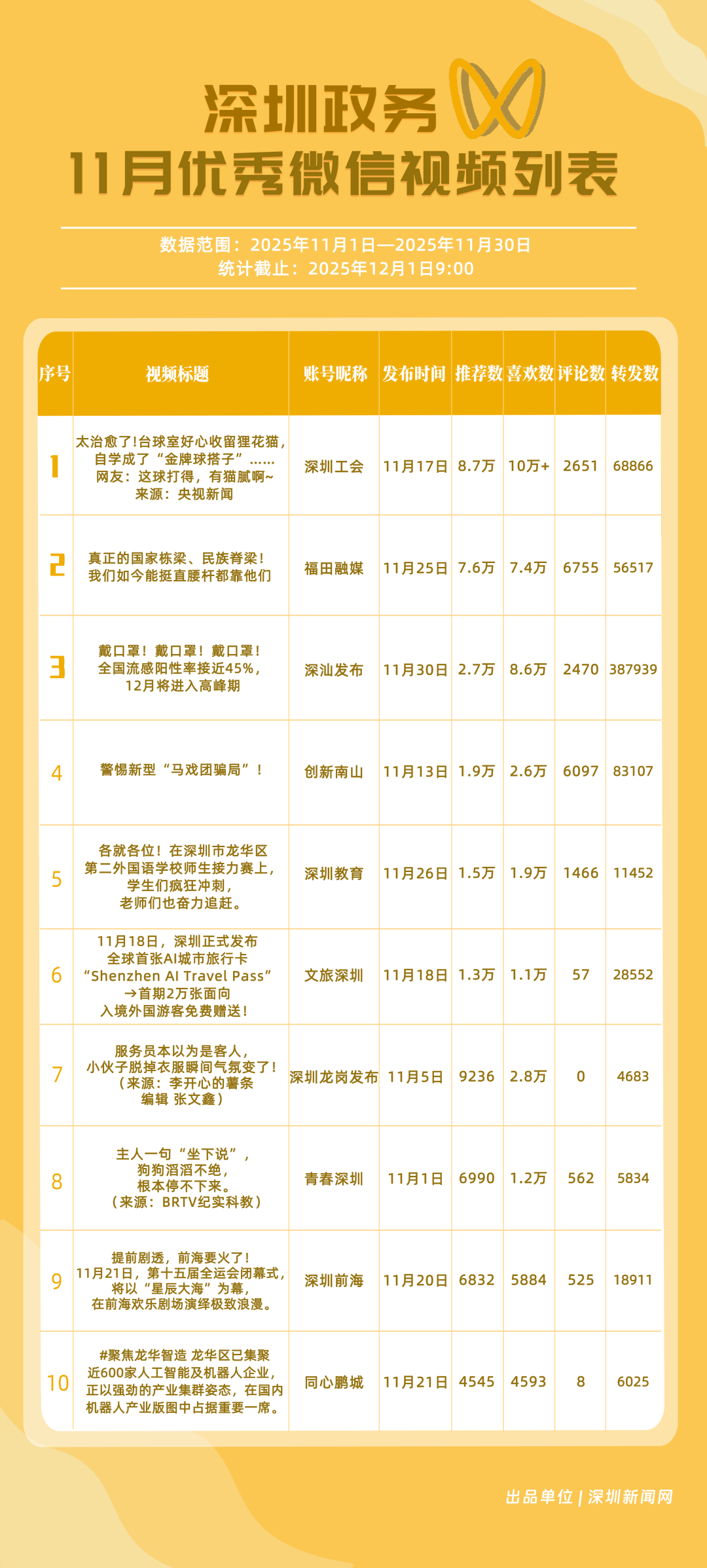 11月,“福田融媒”“深汕發(fā)布”“深圳工會(huì)”“創(chuàng)新南山”“深圳教育”“文旅深圳”“深圳光明”“深圳應(yīng)急管理”“深圳天氣”“深圳龍華”榮獲“優(yōu)秀政務(wù)微信視頻號(hào)”稱號(hào)。“福田融媒”月總轉(zhuǎn)發(fā)量超60萬(wàn)次,各方面發(fā)揮穩(wěn)定,位居榜單第一;“深汕發(fā)布”一條“流感陽(yáng)性”視頻提醒市民關(guān)注健康信息,單條視頻轉(zhuǎn)發(fā)超30萬(wàn)次,助推其位列榜單第二名;“深圳工會(huì)”積極轉(zhuǎn)載網(wǎng)絡(luò)熱門信息,內(nèi)容多元,位列榜單第三名?!皠?chuàng)新南山”“深圳教育”等賬號(hào)緊隨其后。上榜微信視頻號(hào)以輕量化短視頻為載體,將政務(wù)信息轉(zhuǎn)化為公眾喜聞樂(lè)見(jiàn)的內(nèi)容形式,最終打造出兼具傳播力與親和力的政務(wù)宣傳新名片。
