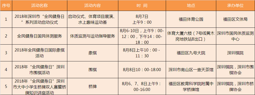 為迎接今年8月8日第十個全國“全民健身日”,增強(qiáng)全民健身意識,培養(yǎng)良好的體育鍛煉習(xí)慣,在全社會形成崇尚健身、參與健身、支持和推動全民健身事業(yè)發(fā)展的良好環(huán)境和氛圍,為構(gòu)建和諧社會發(fā)揮積極的作用,深圳市體育中心積極開展全民健身日免費(fèi)開放系列活動,于8月8日免費(fèi)開放(深圳體育館、深圳游泳跳水館、深圳網(wǎng)球中心、深圳體育場等四家體育場館,田徑、籃球、廣場體育、游泳、保齡球、壁球和網(wǎng)球7個項目。